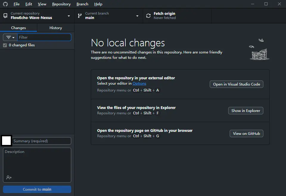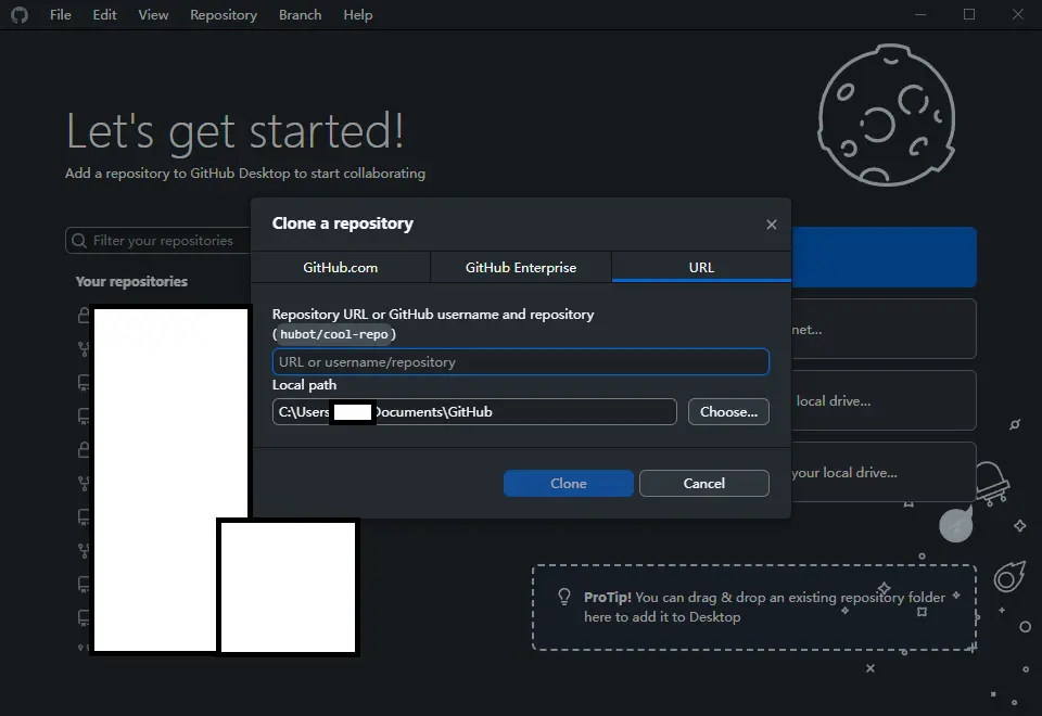 1. 打开Github Desktop 点击左侧Clone开头的按钮 在新弹出的窗口中选择URL 第一栏输入https://github.com/FET-CN/FlowEcho-Wave-Nexus.git 第二栏点击右侧Choose按钮以选择一个你希望存放仓库的文件夹 最后点击Clone 等待下图界面出现