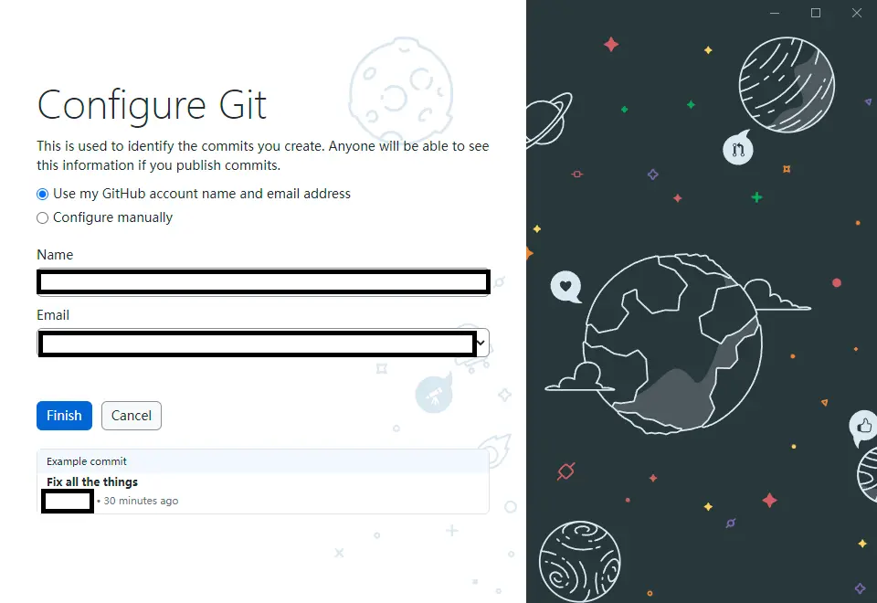 5. 此时授权完成 回到Github Desktop 会进入如下图所示的界面 勾选Use my开头的选项后再点击蓝色Finish按钮即可